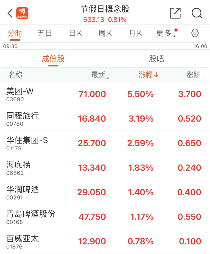 2月14日,港股旅游、酒店、博彩、餐饮等节假日概念股集体上涨。截至收盘,正味集团涨超41%,卫龙美味涨超12%,燕之屋涨超11%,澜沧古茶涨超10%,百果园集团涨超8%,美高梅中国涨超9%,美团-W涨超5%,同城旅行涨超3%,银河娱乐涨超3%,百胜中国涨超2%,奈雪的茶涨近2%,海底捞涨超1%。