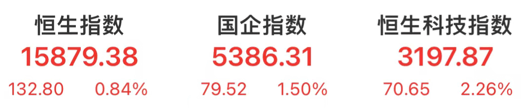 2月14日,在外围市场大跌的情况下,港股三大指数低开高走。早盘,港股反弹。午后,港股涨幅不断扩大,截至收盘,恒生指数涨0.84%,报15879.38点。恒生国企指数涨1.5%,报5386.31点。恒生科技指数涨2.26%,报3197.87点。