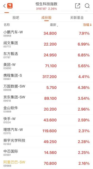 科技股强势拉升全线走强,截至收盘,小鹏汽车-W涨近8%,阅文集团涨近7%,东方甄选涨超6%,美团-W涨超5%,携程集团-S涨超4%,京东集团-SW涨超3%,阿里巴巴-SW涨超2%。