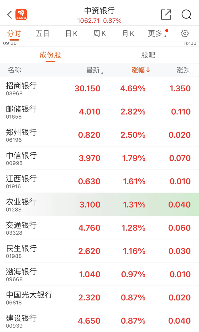 权重股板块也集体上攻,招商银行涨超4%,中国中免涨超5%,东方海外国际涨超3%,万科企业涨超3%,邮储银行涨超2%,中芯国际涨超2%。