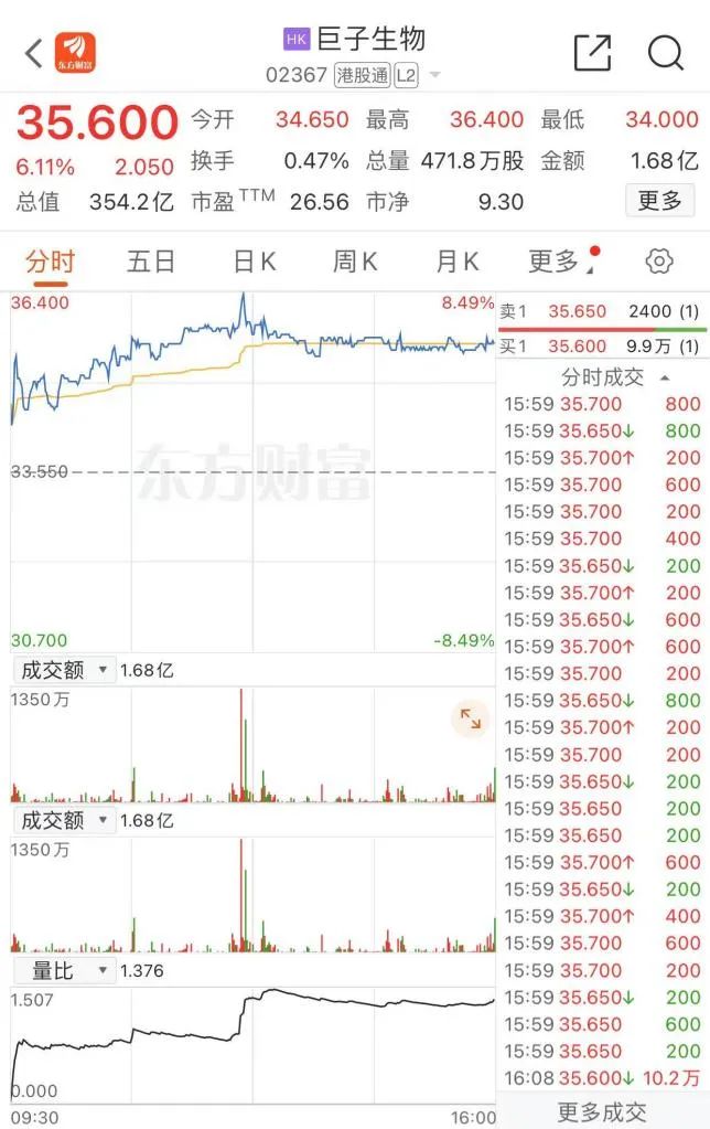 2月14日,港股巨子生物高开高走,截至收盘,涨幅达到6.11%,报35.6港元/股,总市值354.2亿港元。